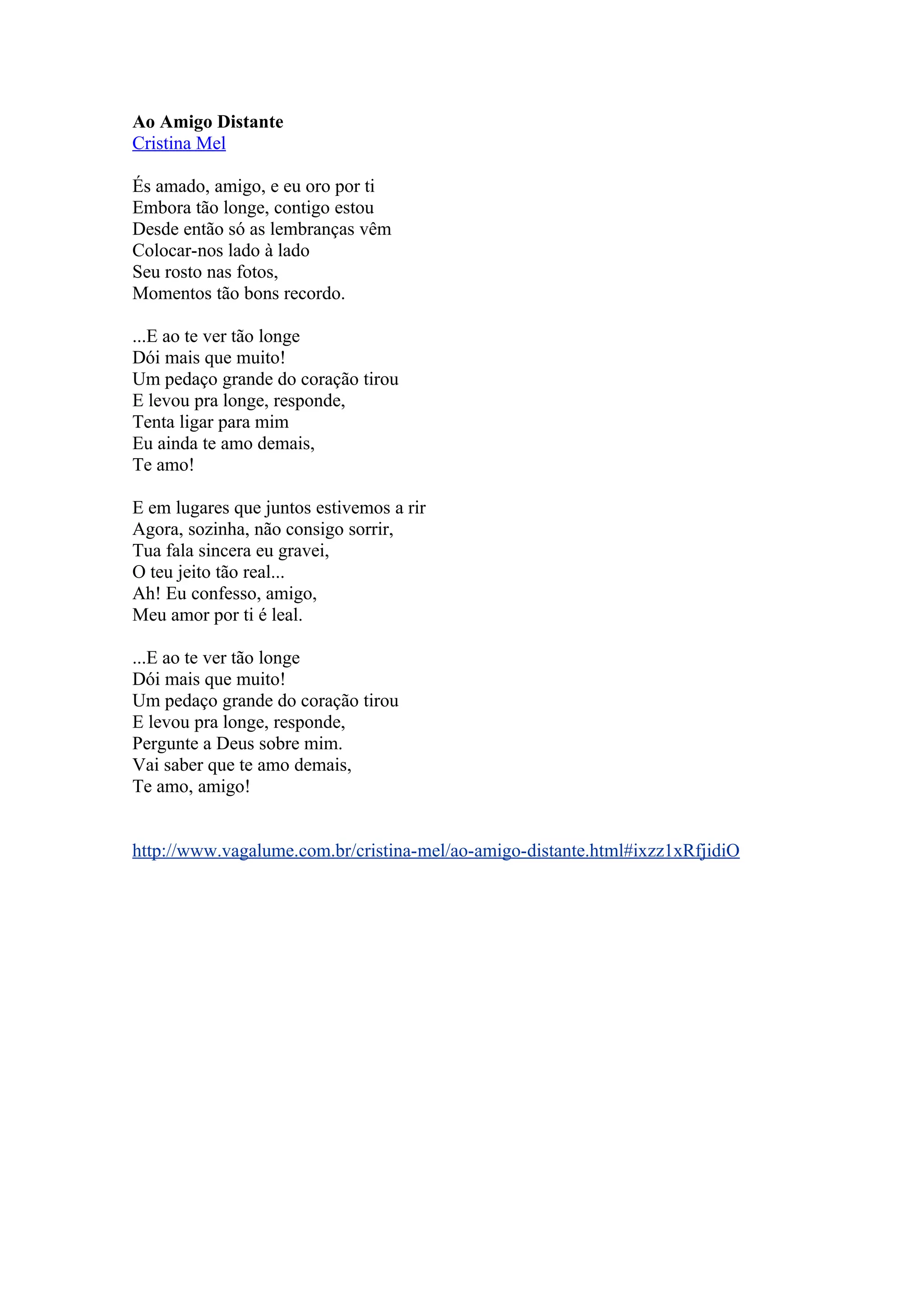 A poema expressa a dor da distância de um amigo muito amado. A autora recorda com saudade os momentos felizes que passaram juntos e sente falta da presença e conversa sincera do amigo. Embora longe, o amor e lealdade que sente por ele permanecem intactos.