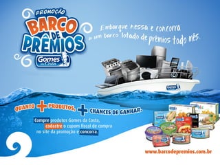 A promoção "Barco de Prêmios" tinha como objetivo reforçar a associação da marca Gomes da Costa com o mar e envolver os consumidores através de prêmios aspiracionais. Foram sorteados três barcos por mês como prêmios principais e vários vales-compras diários. A comunicação no ponto de venda destacava a ilha e incentivava a equipe de vendas. A mecânica era simples: o consumidor comprava produtos participantes, cadastrava-se no site e concorria aos sorteios. A prom