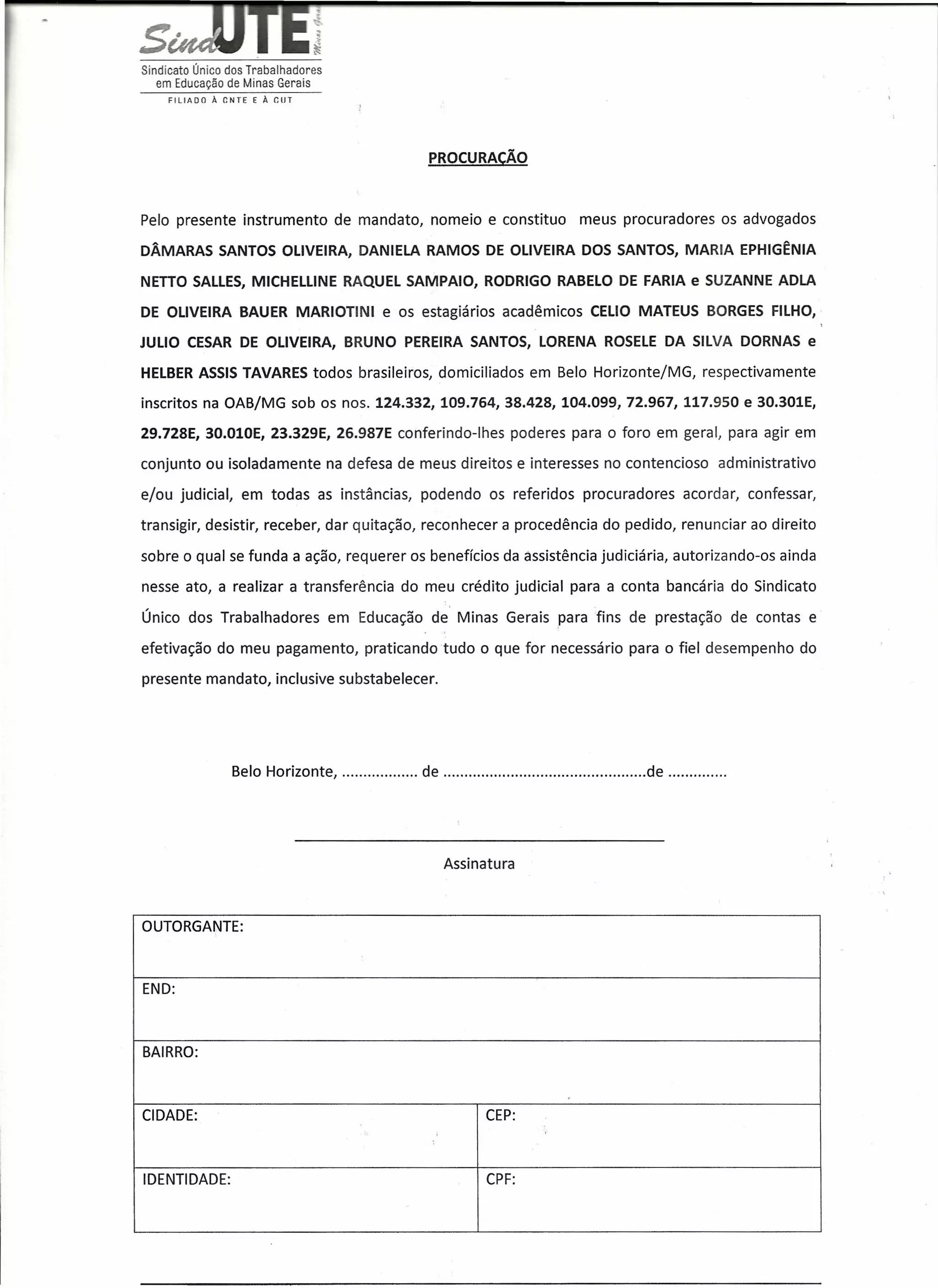Este documento é uma procuração concedida pelo Sindicato Único dos Trabalhadores em Educação de Minas Gerais a vários advogados e estagiários para representá-los em processos judiciais e administrativos, autorizando-os a realizar acordos, transações e transferências bancárias relacionadas aos processos.