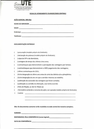 (1) O documento é uma ficha de atendimento de um sindicato de educação em Minas Gerais para ações judiciais relacionadas a 300 dias de trabalho. (2) A ficha lista os documentos necessários para o processo, como procuração, declaração de pobreza, contracheques e publicações. (3) A ficha também registra informações do servidor e observa que os documentos só serão aceitos na sede central de forma completa.