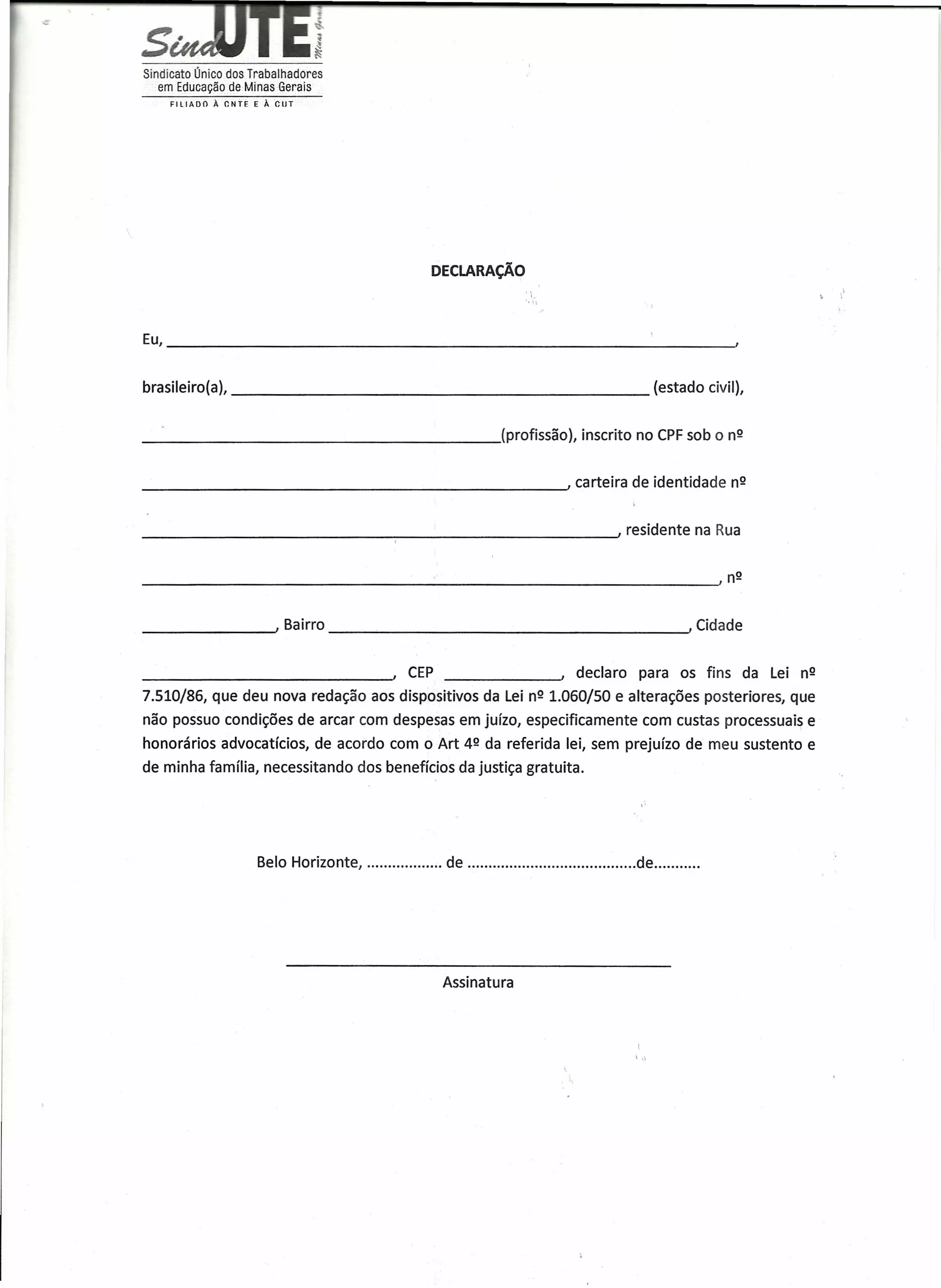 Este documento é uma declaração de um trabalhador brasileiro afirmando que não tem condições financeiras de arcar com as despesas judiciais, como custas processuais e honorários advocatícios, sem prejudicar seu sustento e da família, necessitando assim dos benefícios da justiça gratuita. O documento fornece detalhes como nome, estado civil, profissão, CPF e endereço da pessoa declarante.