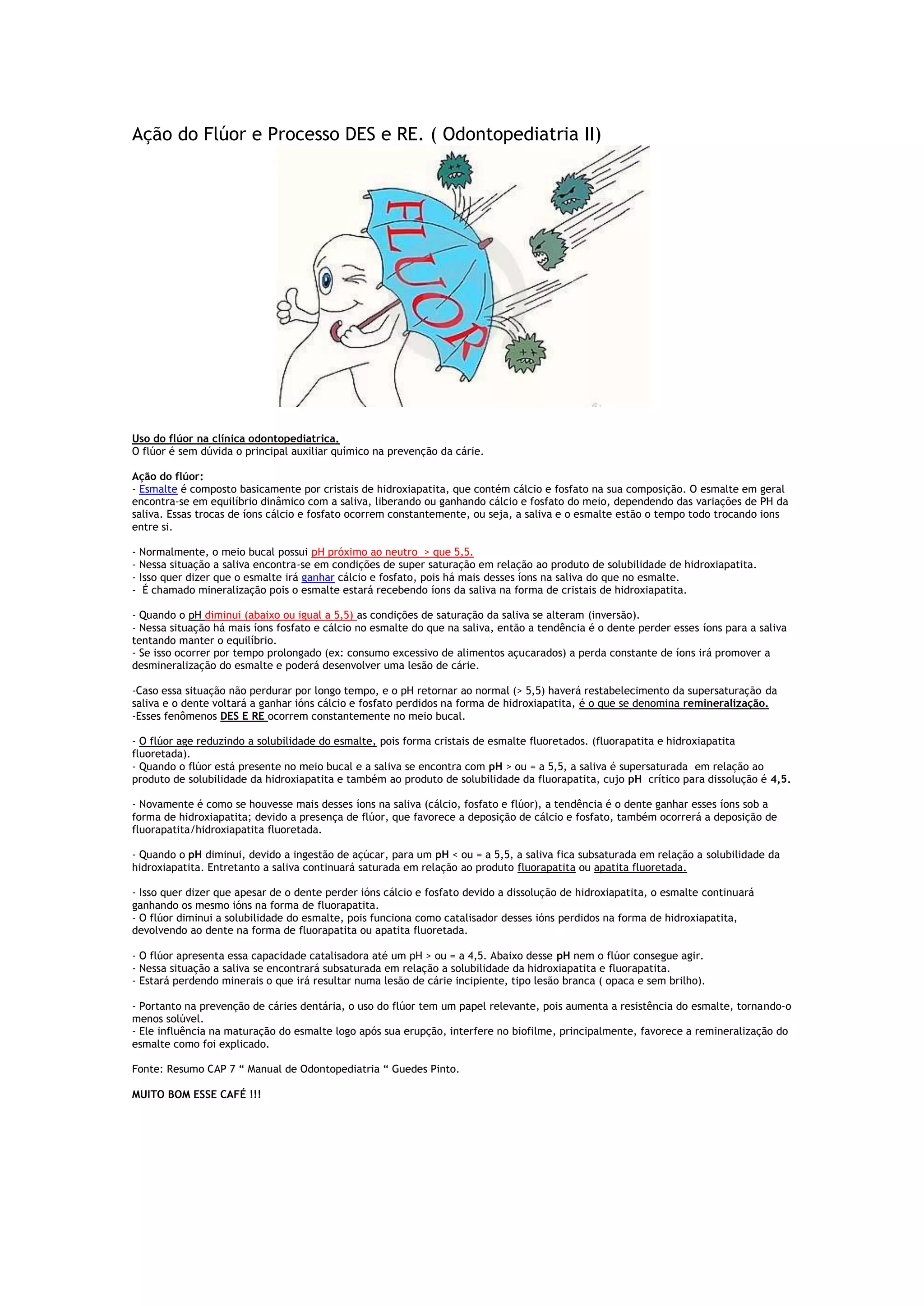 O documento descreve a ação do flúor na prevenção de cáries dentárias, explicando que o flúor torna o esmalte menos solúvel ao formar cristais de fluorapatita e hidroxiapatita fluoretada. Isso aumenta a resistência do esmalte e permite a remineralização mesmo quando o pH da saliva cai, prevenindo assim a desmineralização e formação de cáries. O flúor também influencia a maturação do esmalte e interfere no biofilme, contribuindo ainda mais para a prevenção de c