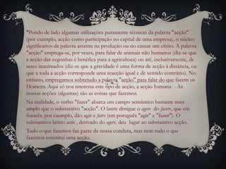 1. O documento discute os conceitos básicos da ação humana, distinguindo ações conscientes e intencionais de outras atividades involuntárias.