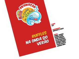 Este documento descreve uma promoção conjunta entre a marca de batatas Ruffles e o parque aquático Wet'n Wild. A promoção tem como objetivo divulgar o novo sabor de verão de Ruffles e aumentar as vendas durante as férias de verão, estreitando os laços com os consumidores por meio de experiências no parque. A promoção ocorrerá nos fins de semana em São Paulo durante 4 meses, com atrações temáticas no parque e materiais promocionais nas lojas.
