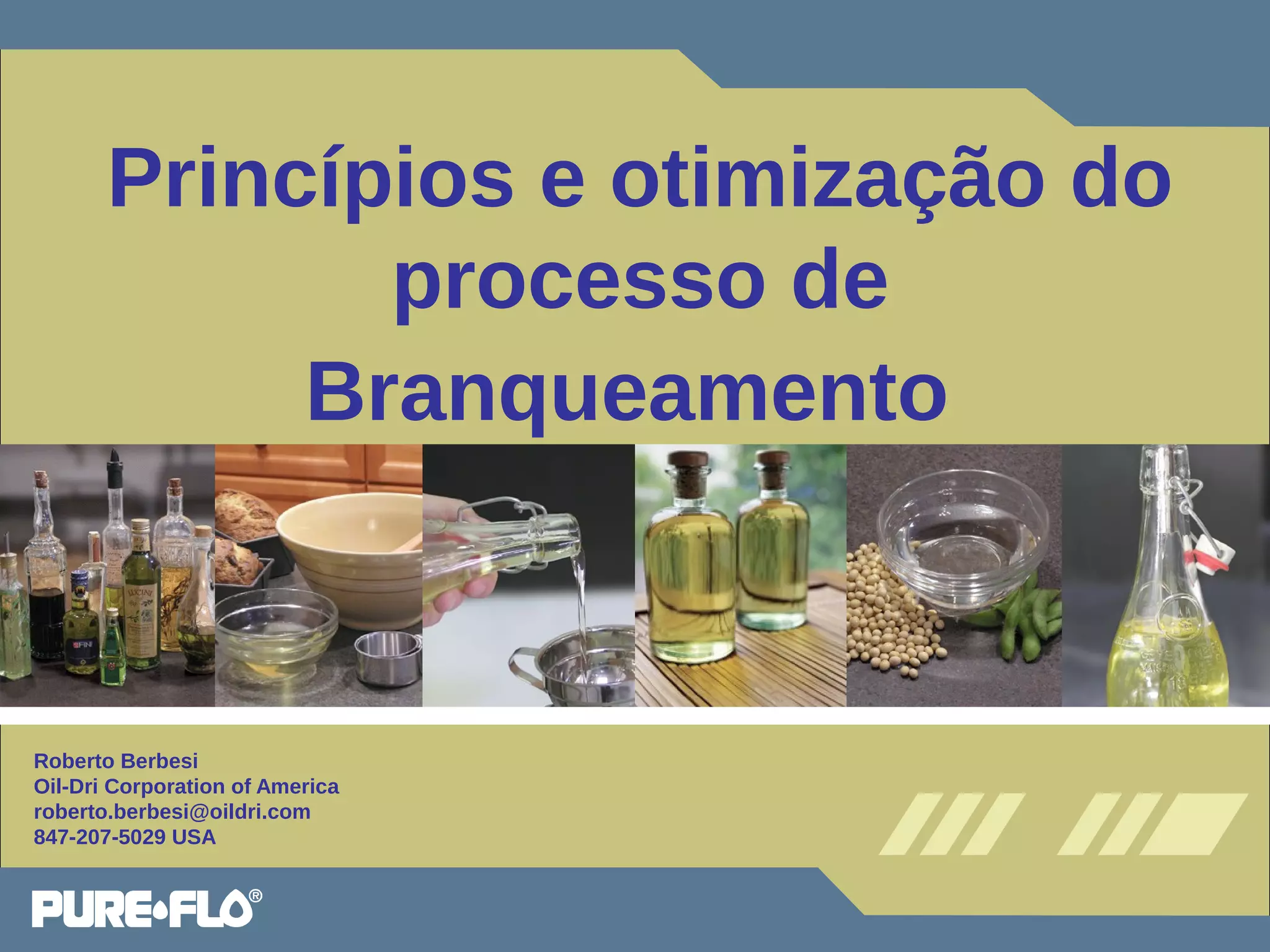O documento discute os princípios e otimização do processo de branqueamento de óleos vegetais. Aborda o que é o branqueamento, como funciona a terra de branqueamento e os mecanismos de adsorção. Também explica como selecionar as melhores condições de processo e terra de acordo com variáveis de qualidade como clorofila, cor, fósforo e ácidos graxos livres.
