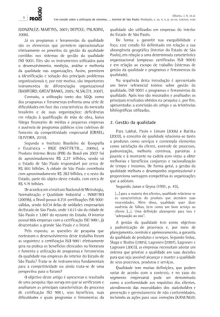 Este documento apresenta os resultados de uma pesquisa sobre a utilização de sistemas de gestão da qualidade e programas/ferramentas da qualidade em 236 empresas do interior de São Paulo. A pesquisa mostrou que a certificação ISO 9001 gera benefícios como melhoria nos processos, satisfação dos clientes e imagem, mas também revelou a importância dos programas/ferramentas para a adequação aos requisitos da norma.