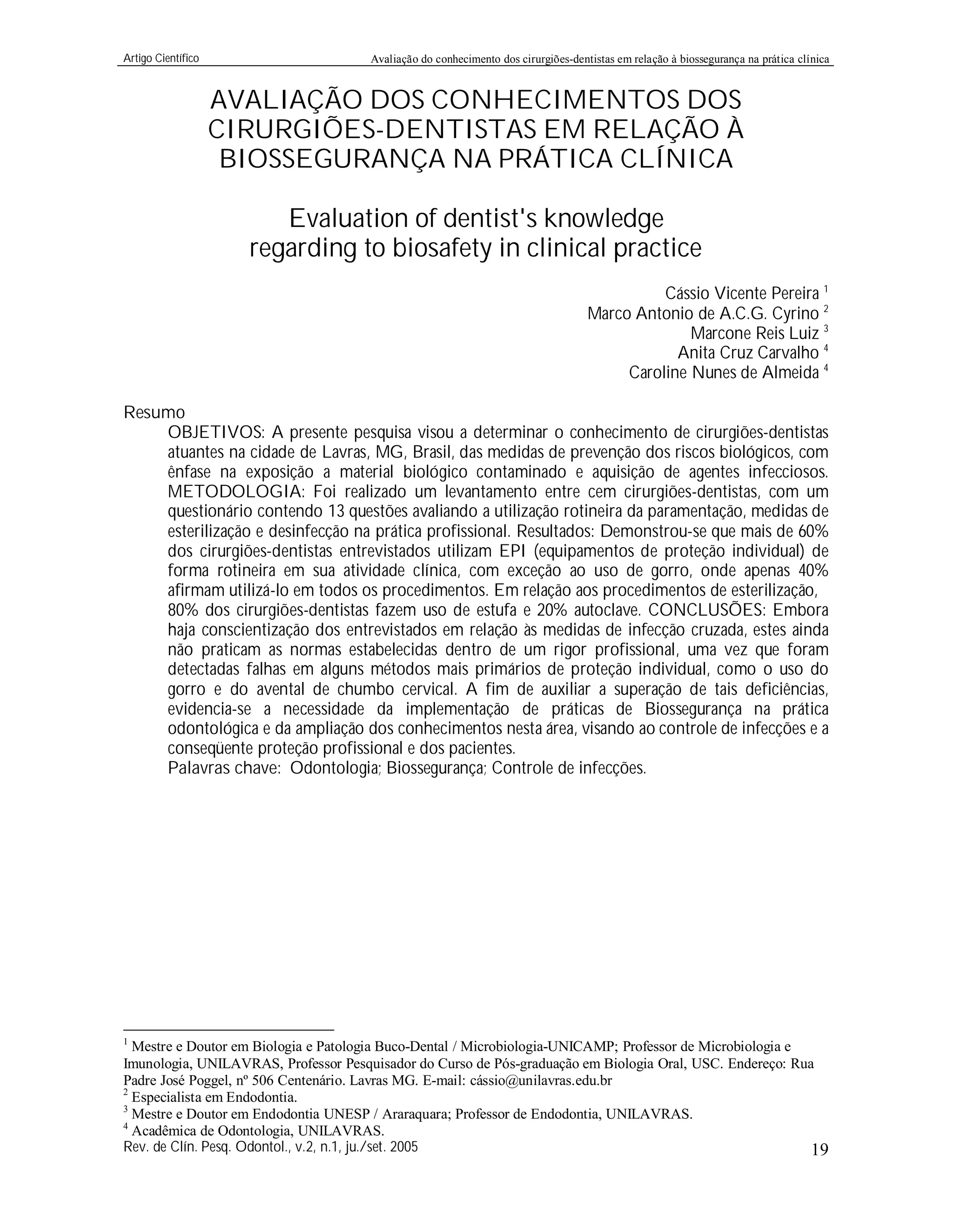 Este artigo científico avalia o conhecimento de 100 cirurgiões-dentistas em Lavras, MG sobre biossegurança na prática clínica. Os resultados mostraram que mais de 60% usam equipamentos de proteção individual rotineiramente, exceto gorros (40%). A maioria esteriliza instrumentos usando estufa (80%) ou autoclave (20%). Conclusões indicam que embora haja conscientização sobre medidas de prevenção de infecções cruzadas, ainda há falhas em proteção individual como uso de gorros, necessitando de mais treinamento em