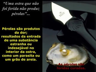 Pérolas são formadas quando um grão de areia ou parasita penetra no interior de uma ostra, causando uma ferida. As células do nácar da ostra trabalham para cobrir a substância estranha com camadas protetoras, formando gradualmente uma pérola. Da mesma forma, os seres humanos podem transformar suas mágoas e feridas em algo belo, cobrindo-as com camadas de amor e perdão em vez de ressentimento.
