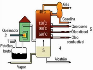 3) As etapas do refino como filtração, decantação e destilação fracionada para separar as frações do petróleo.