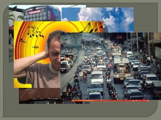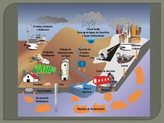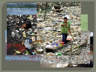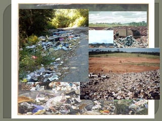 O documento discute vários tipos de poluição, incluindo poluição do solo, água, ar, som e luz. A poluição pode danificar o meio ambiente e a saúde humana através da introdução de substâncias tóxicas. O documento também descreve a política dos 3Rs - reduzir, reutilizar e reciclar - para lidar com resíduos de forma sustentável.