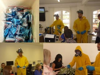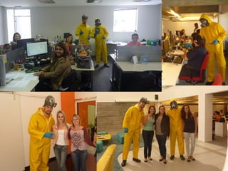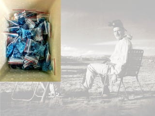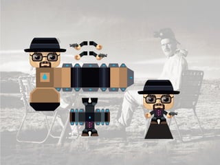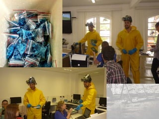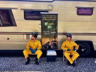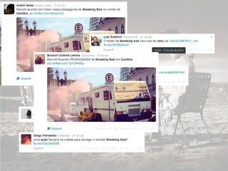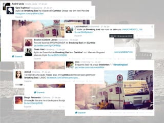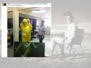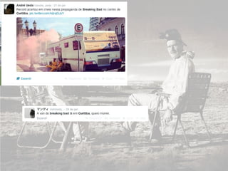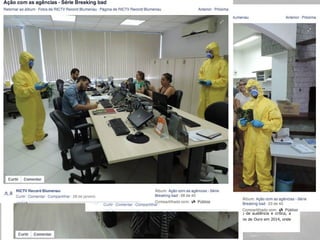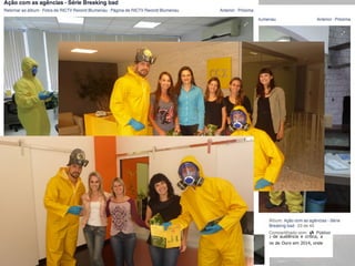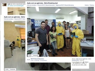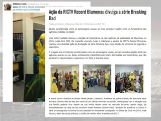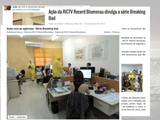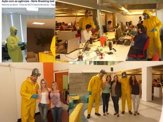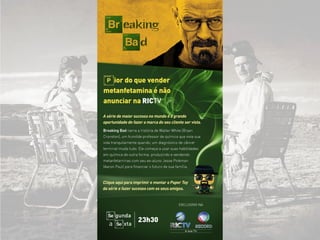 O documento descreve dois desafios de marketing para anunciar o lançamento da série Breaking Bad na emissora RICTV Record: 1) despertar a atenção do público final e 2) chamar a atenção das agências de publicidade. A solução para o primeiro desafio foi recriar cenas icônicas da série em locais públicos oferecendo brindes. A solução para o segundo desafio foi enviar promotores caracterizados como personagens da série às agências distribuindo "metanfetaminas" (na verdade pirulitos) e material promocional