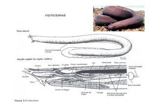 O documento descreve as características de duas classes de cordados primitivos: os ciclostomados, representados pelas feiticeiras e lampreias. As feiticeiras são marinhas e alongadas, enquanto as lampreias são migratórias e parasitas de outros peixes. Embora semelhantes em tamanho e forma, as lampreias diferenciam-se das feiticeiras por possuírem vértebras rudimentares.