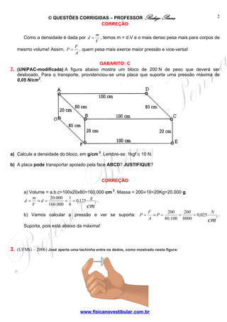 Este documento apresenta um resumo de questões corrigidas sobre hidrostática. O índice lista os principais tópicos abordados: conceitos de densidade e pressão, pressão atmosférica e experiência de Torricelli, teorema de Stevin e aplicações, princípio de Pascal, e princípio de Arquimedes. As questões fornecem exemplos práticos sobre esses conceitos e seus cálculos.
