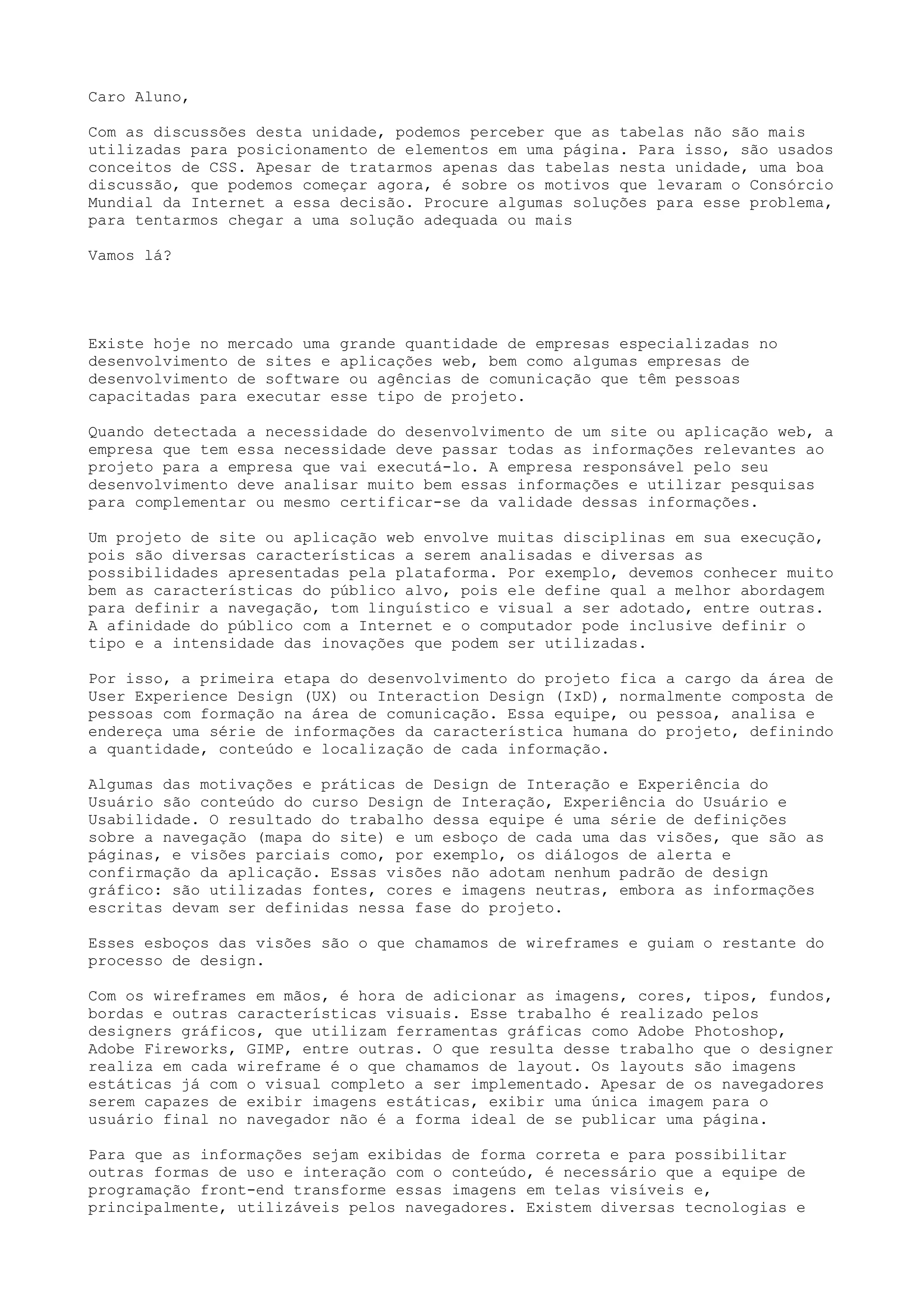1) O documento discute as etapas de desenvolvimento de um site ou aplicação web, incluindo análise de usuários, criação de wireframes, design gráfico e programação front-end.