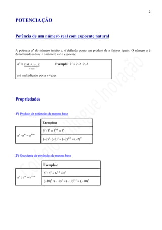 Este documento discute potenciação e radiciação de números reais. [1] Ele define potência de um número real com expoente natural e lista propriedades como o produto, quociente e potência de potências. [2] Discute também potência com expoente inteiro negativo, definindo-a como o inverso da potência com expoente positivo correspondente. Por fim, aborda o sinal de potências com base positiva ou negativa.
