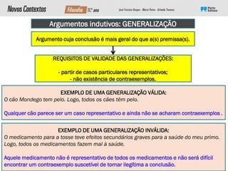 O documento discute diferentes tipos de argumentos não dedutivos, incluindo argumentos indutivos como generalização e previsão, argumentos por analogia, e argumentos de autoridade. Argumentos indutivos generalizam a partir de casos particulares representativos ou preveem casos futuros com base em observações passadas, enquanto argumentos por analogia e de autoridade comparam situações semelhantes ou se apoiam na opinião de especialistas.