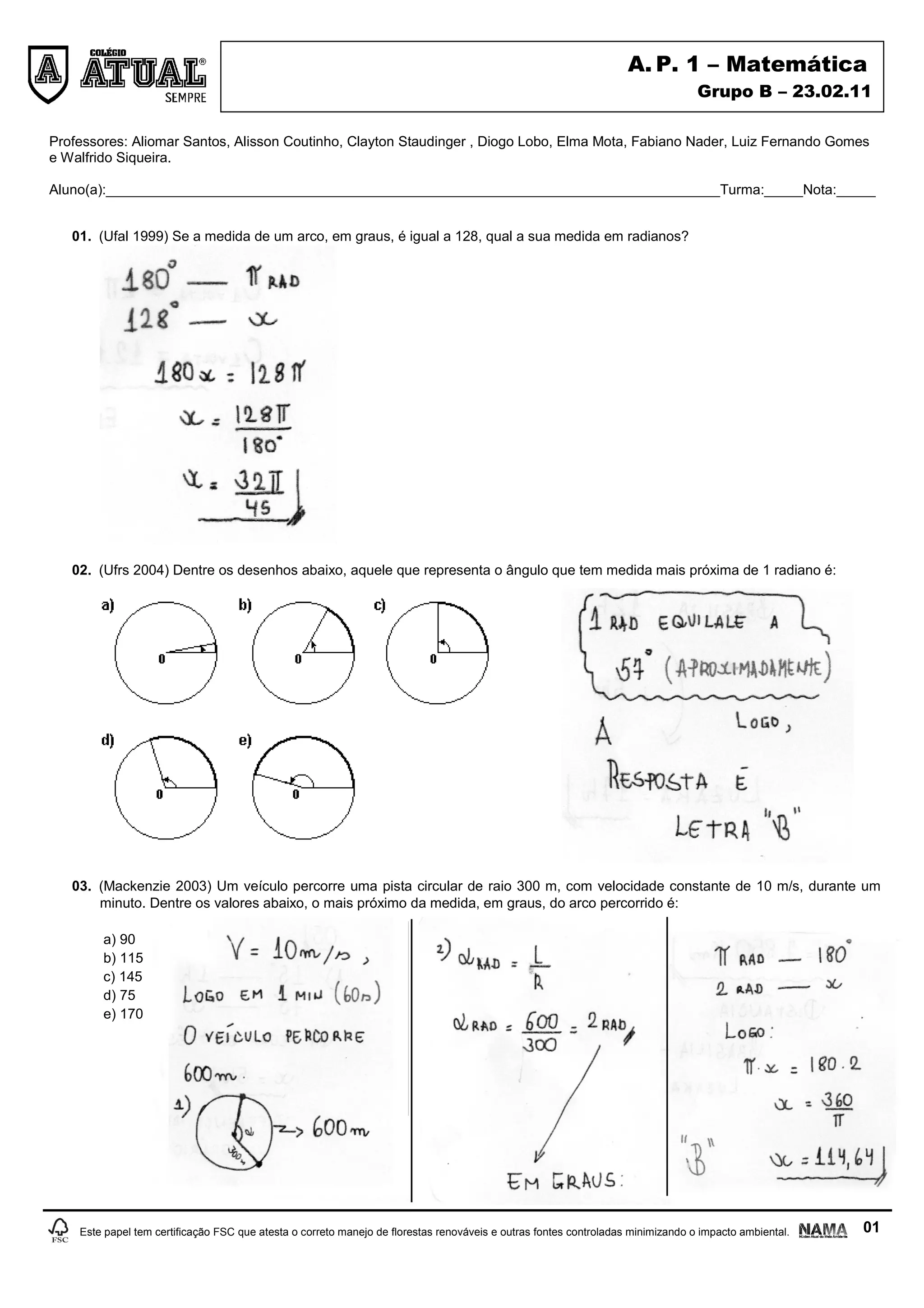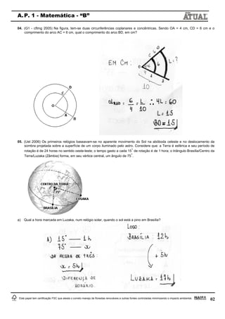 Este documento contém 10 questões de matemática sobre geometria plana e espacial. As questões abordam tópicos como conversão entre medidas de ângulos em radianos e graus, cálculo de comprimentos de arcos em circunferências, propriedades de figuras planas e sólidos geométricos.