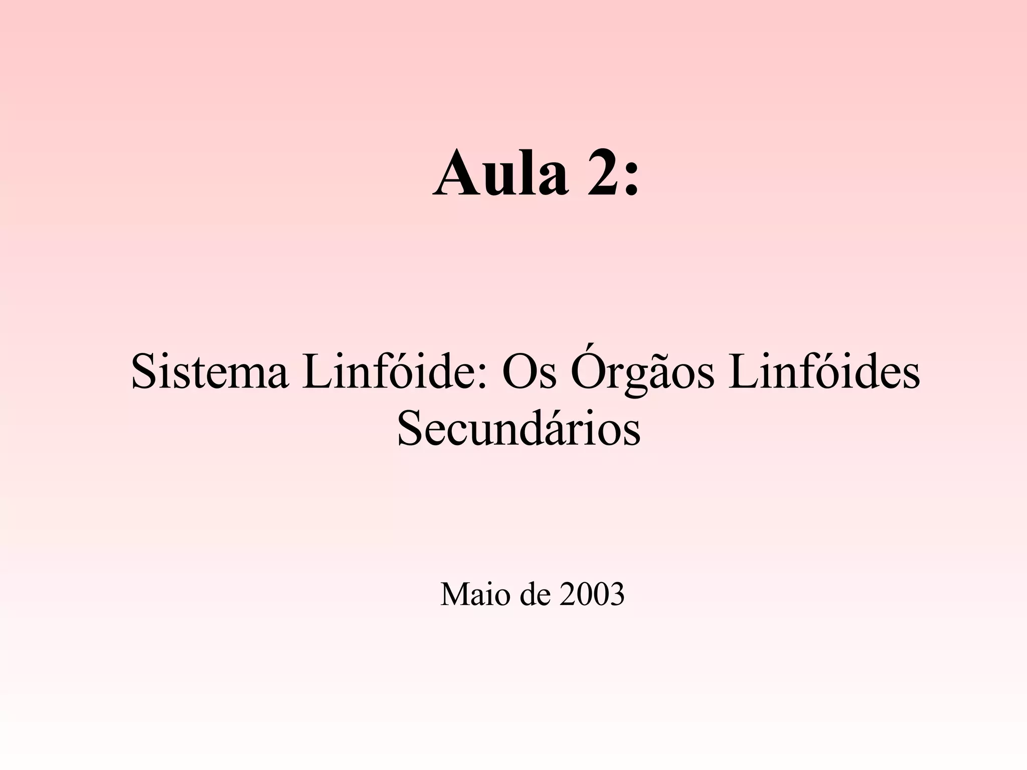 O documento descreve os órgãos linfóides secundários, incluindo linfonodos, baço e tecido linfóide associado às mucosas. Os linfonodos contêm córtex externo com folículos, paracórtex e medula com seios e cordões. O baço contém polpa branca com linfócitos e polpa vermelha com hemácias. O tecido linfóide associado às mucosas inclui placas de Peyer e tonsilas.