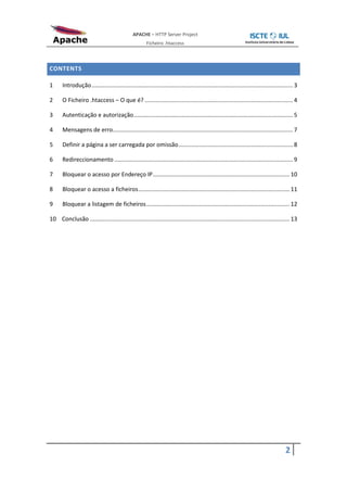 1. O documento descreve as funcionalidades do arquivo .htaccess no Apache HTTP Server, incluindo autenticação, redirecionamento, bloqueio de acesso e configuração de mensagens de erro.