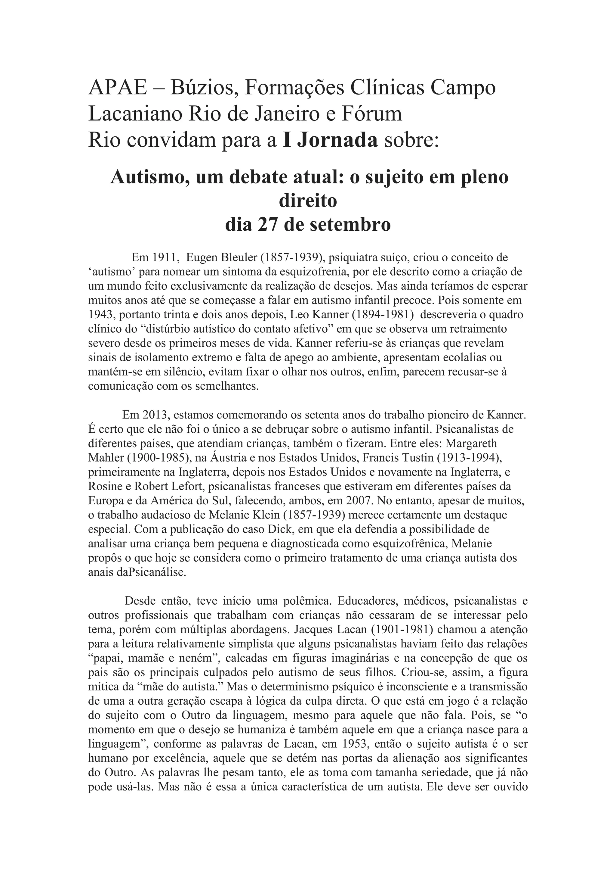 O documento convida para a I Jornada sobre Autismo em 27 de setembro, resumindo a história do conceito de autismo desde 1911 e as múltiplas abordagens ao longo do tempo. Discute o uso de objetos pelos autistas, se são vetores de abertura ou fechamento, e convoca a legitimar a criança autista como sujeito de direito.