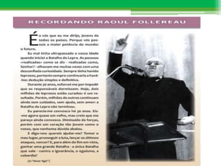 O documento descreve a Associação Portuguesa Amigos de Raoul Follereau (APARF), uma instituição de caridade fundada em 1987 para ajudar pessoas com hanseníase. A APARF financia tratamentos, reabilitação e projetos em 4 continentes para combater a doença e prestar assistência aos pacientes. O documento também discute Raoul Follereau, um ativista francês que ajudou a aumentar a conscientização sobre a hanseníase.