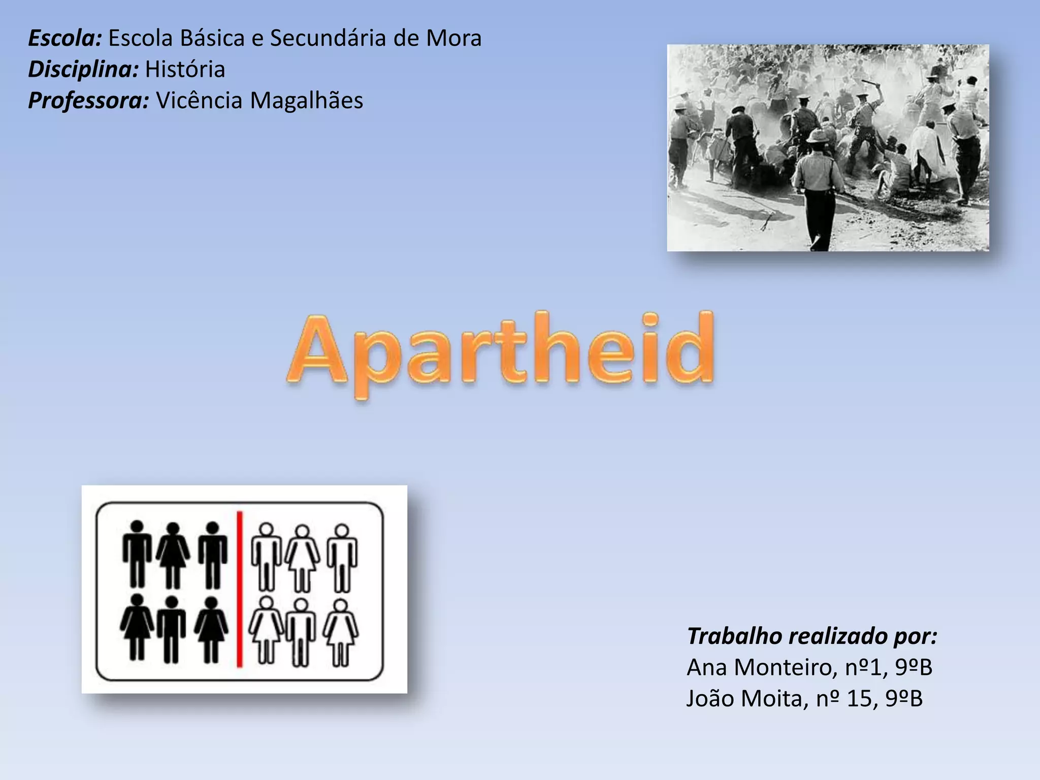 Este documento resume um trabalho de pesquisa sobre o Apartheid na África do Sul. Detalha as leis segregacionistas do regime do Apartheid, como proibia casamentos entre raças e limitava os direitos dos negros. Explica que o Apartheid acabou na década de 1990 com a libertação de Nelson Mandela e a eleição do primeiro presidente negro na África do Sul.
