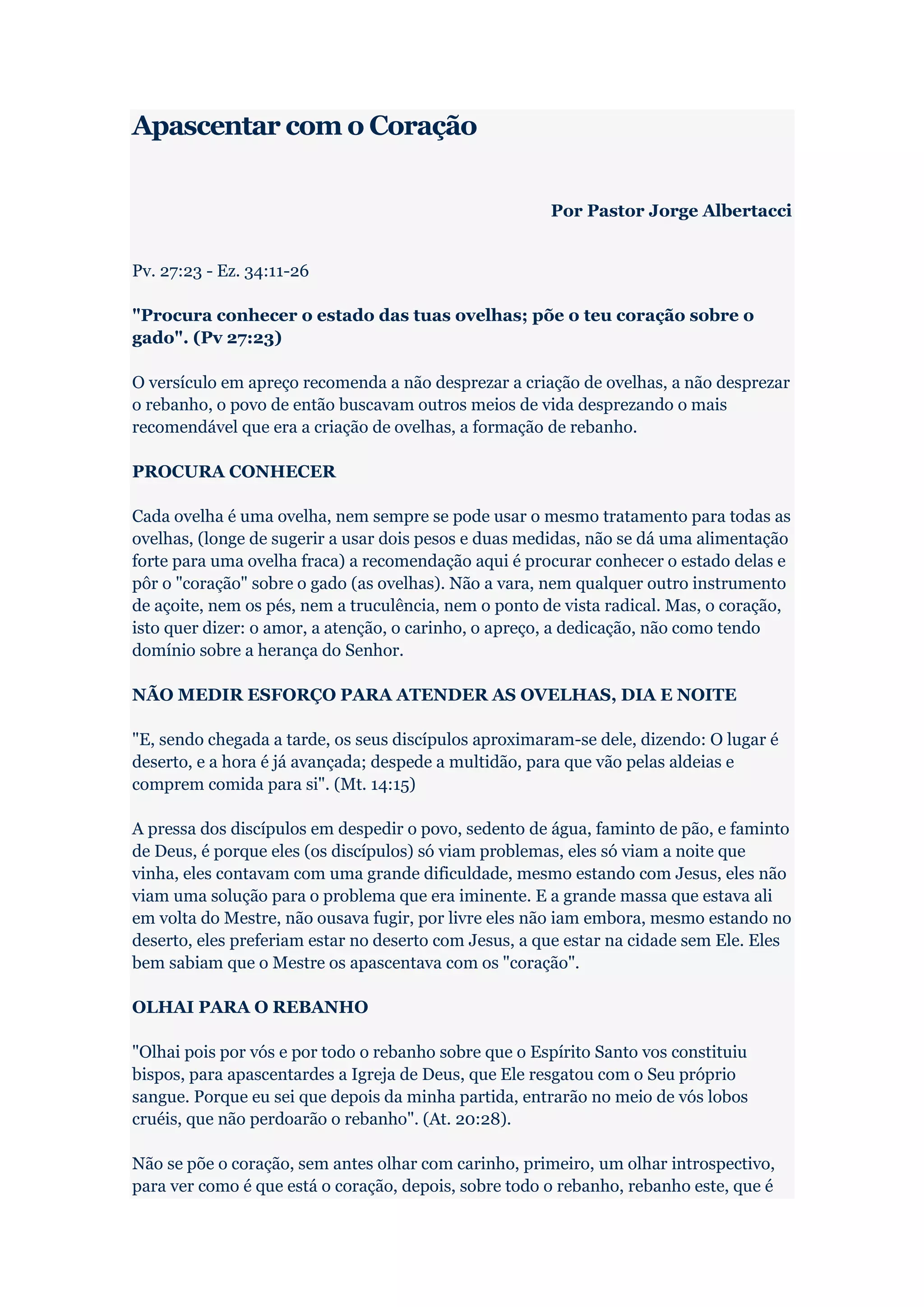 O documento discute como apascentar o rebanho de Deus com o coração, não pela força ou ganância. Recomenda conhecer o estado de cada ovelha e cuidar delas com amor, atenção e dedicação, não como tendo domínio sobre elas. Aderne que os obreiros devem amar a Deus primeiro e servir como exemplo ao rebanho, apascentando-os voluntariamente.