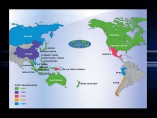 O documento discute a Associação de Nações do Sudeste Asiático (ASEAN), um bloco econômico formado em 1967 com o objetivo de estimular o comércio entre seus membros através da redução de tarifas alfandegárias e a aproximação econômica entre os países. O bloco reúne dez países do sudeste asiático e representa uma população de aproximadamente 650 milhões de habitantes.