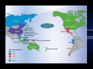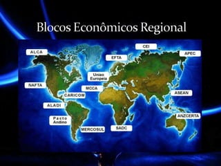 O documento discute a Associação de Nações do Sudeste Asiático (ASEAN), um bloco econômico formado em 1967 por países do sudeste asiático com o objetivo de estimular o comércio entre seus membros e promover o desenvolvimento regional. O bloco reduziu tarifas e buscou soluções comuns para problemas comerciais, aumentando o comércio entre seus países-membros.