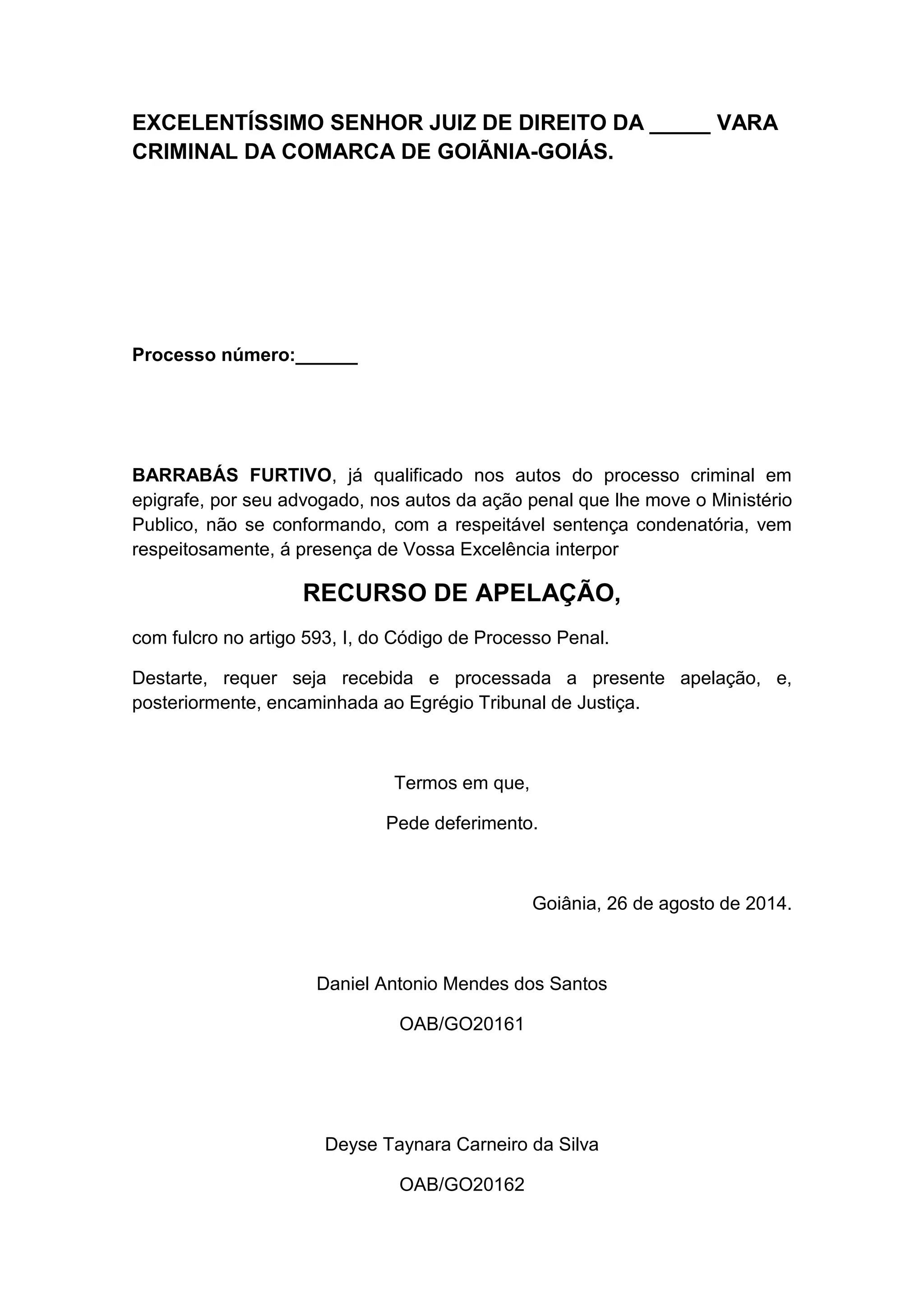 Comarca de Goiânia Goiás, condenou o apelante á pena de 1(um) anos e 4