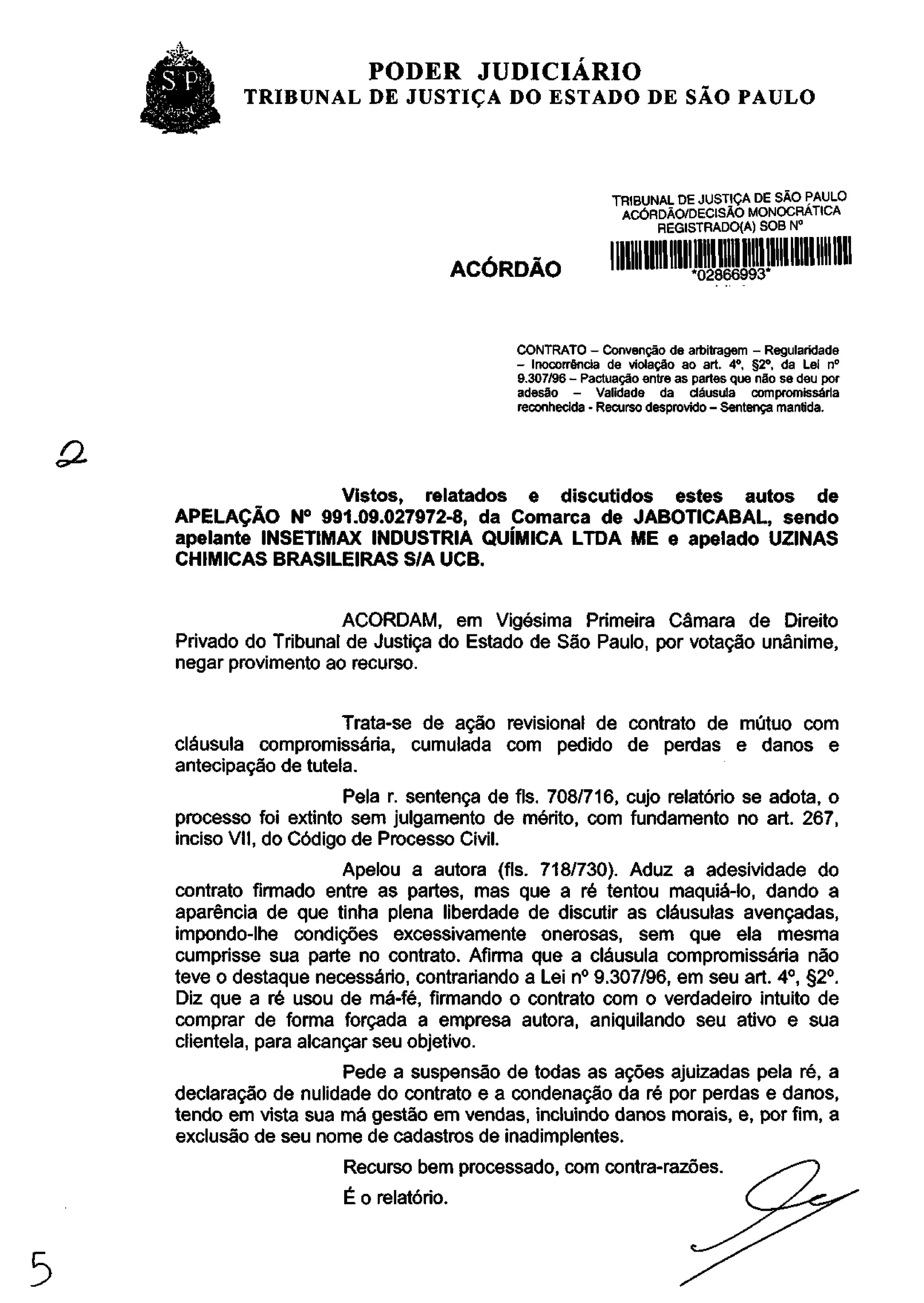 O Tribunal de Justiça de São Paulo manteve a sentença que extinguiu o processo sem julgamento de mérito devido à existência de uma cláusula compromissória no contrato entre as partes. A autora alegou que o contrato era de adesão e que a cláusula não estava destacada, mas o Tribunal concluiu que não havia provas disso, tendo as partes negociado livremente os termos do acordo.