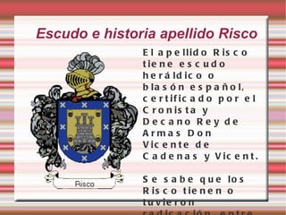 O documento descreve os brasões de armas e a história dos sobrenomes Risco e Cumplido na Espanha. O sobrenome Risco tem um brasão de armas certificado por um rei de armas espanhol. O sobrenome Cumplido também aparece reconhecido por esse mesmo rei de armas em seu repertório de brasões da comunidade espanhola. O gráfico mostra a distribuição geográfica desses sobrenomes na Espanha.