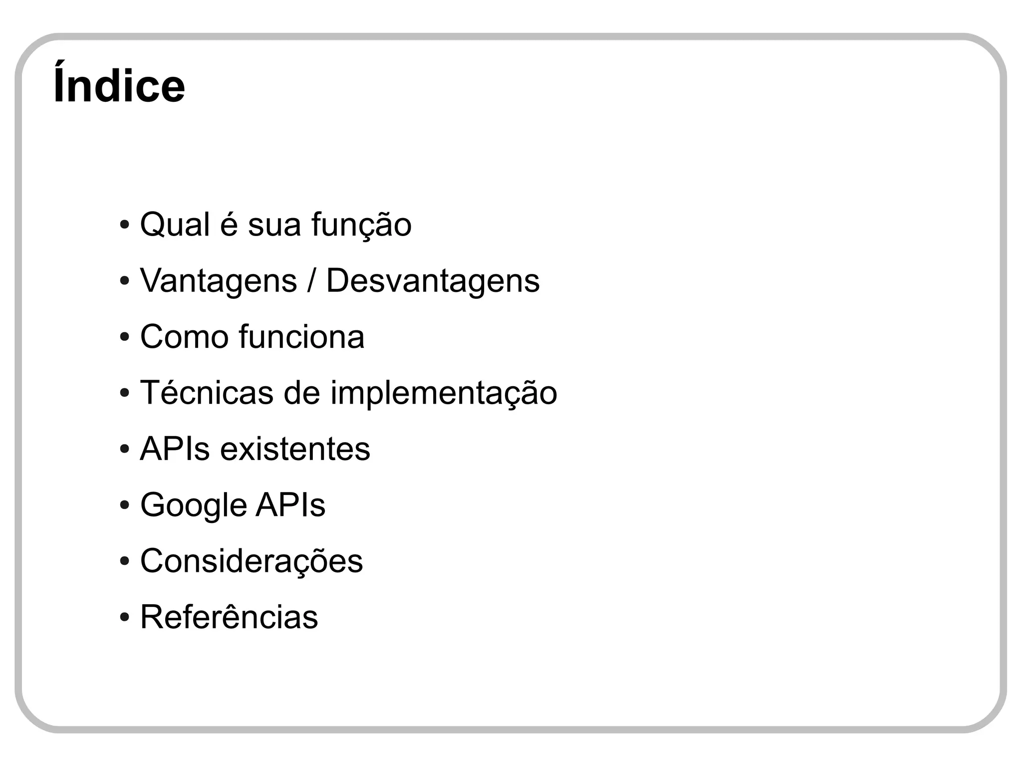 Este documento discute APIs (Interfaces de Programação de Aplicativos), incluindo sua função de fornecer interatividade ao usuário, vantagens como agregar valor ao usuário e aplicação, e técnicas de implementação como SOAP, XML-RPC e REST. Ele também lista exemplos de APIs existentes como Facebook, Flickr e Google APIs como Analytics e Maps.