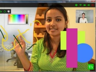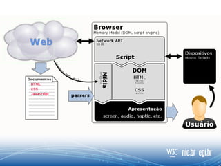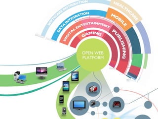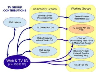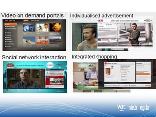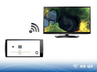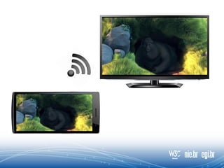 O documento discute as aplicações HTML5 para interação com a TV digital, destacando que a tecnologia web permite melhorar a interatividade da TV através de ecossistemas abertos e funcionamento em qualquer dispositivo. Apresenta também exemplos como second screen, votações, WebRTC e legendas em tempo real que demonstram as oportunidades do HTML5 nesse cenário.