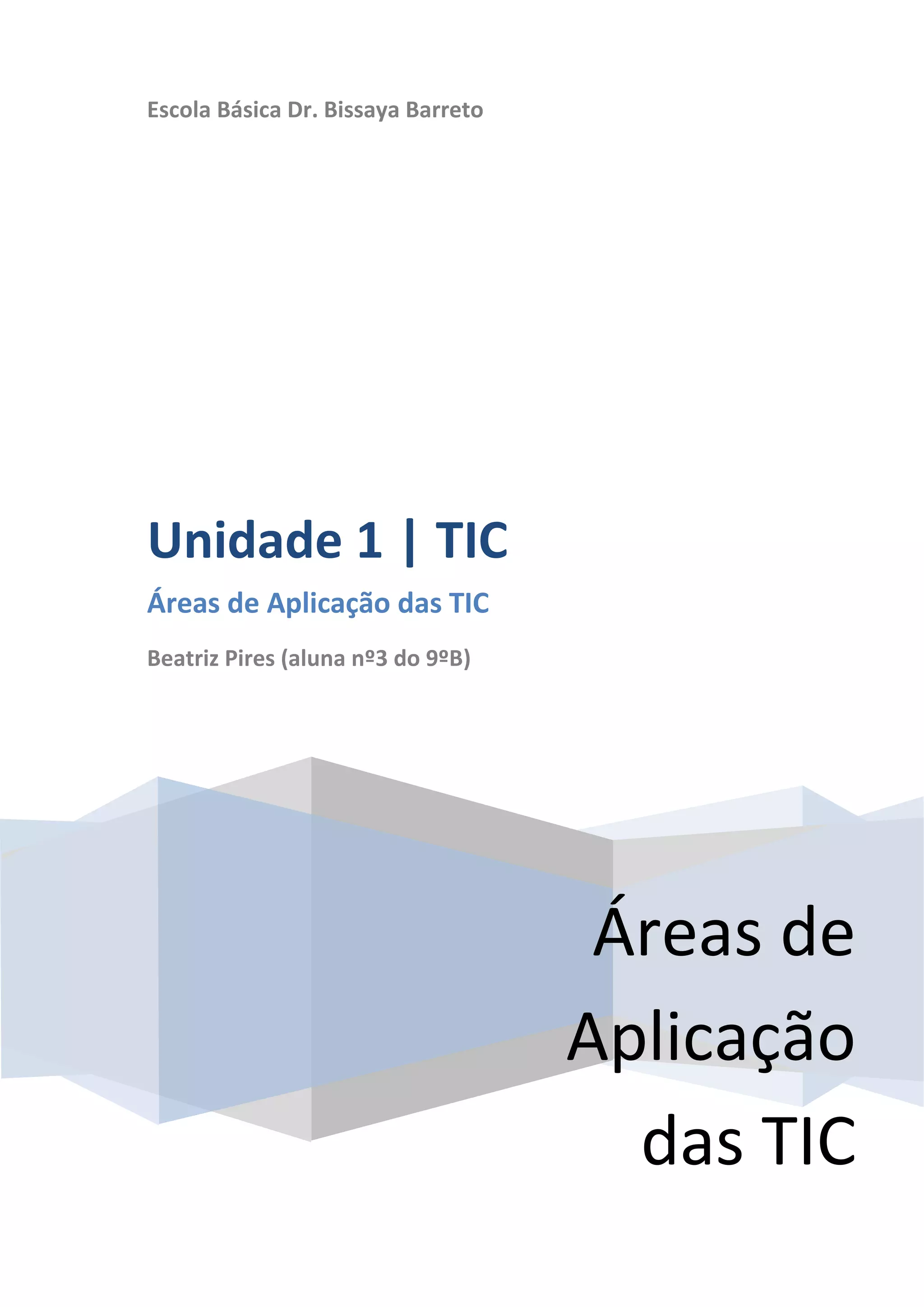 Este documento descreve as principais áreas de aplicação das Tecnologias de Informação e Comunicação (TIC), dividindo-as em Computação, Comunicação e Controlo e Automação. A Computação inclui Informática e Burótica. A Comunicação inclui Telecomunicações e Telemática. O Controlo e Automação inclui Domótica, Robótica, CAD/CAM e Biometria. Exemplos de cada área são fornecidos.