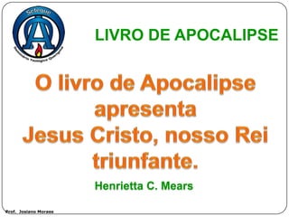 O documento fornece informações sobre o Livro de Apocalipse, incluindo seu autor (João), data de escrita (entre 64-96 d.C.), tema (profecias sobre o triunfo de Cristo sobre as forças do mal), contexto (período de perseguição aos cristãos sob o Império Romano) e propósito (encorajar os cristãos a perseverarem na fé).