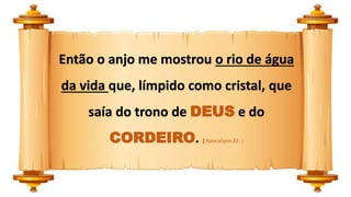 O documento é um resumo dos versículos 22:1-21 do livro bíblico do Apocalipse. Ele descreve a visão de João do rio da água da vida e da árvore da vida na Nova Jerusalém, onde os justos reinarão para sempre na presença de Deus e do Cordeiro.