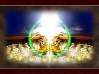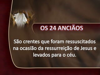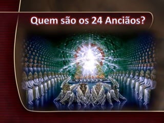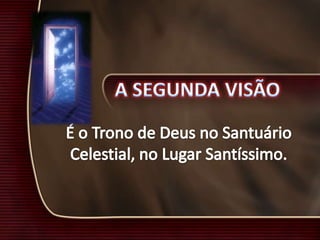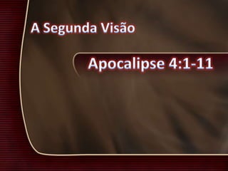 O documento descreve as sete visões de João no livro do Apocalipse, começando com a visão do trono de Deus no céu cercado por seres celestiais. A segunda visão mostra Jesus como o Cordeiro morto no meio do trono, digno de receber adoração. A oração é apresentada como forma de comunicação dos crentes com Deus no céu.