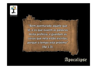O documento apresenta trechos do livro bíblico de Apocalipse. Nele, são descritas visões de Jesus, anjos, cavaleiros do apocalipse, bestas e a batalha final entre o bem e o mal. Menciona a Nova Jerusalém e a vitória final de Deus sobre Satanás.