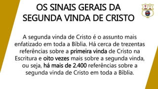 O documento discute a segunda vinda de Cristo, que é amplamente profetizada na Bíblia. Apresenta alguns sinais gerais desta como o aumento de desastres naturais e guerras. Também reflete sobre como os cristãos devem viver em expectativa desta, sendo bons administradores dos dons de Deus.
