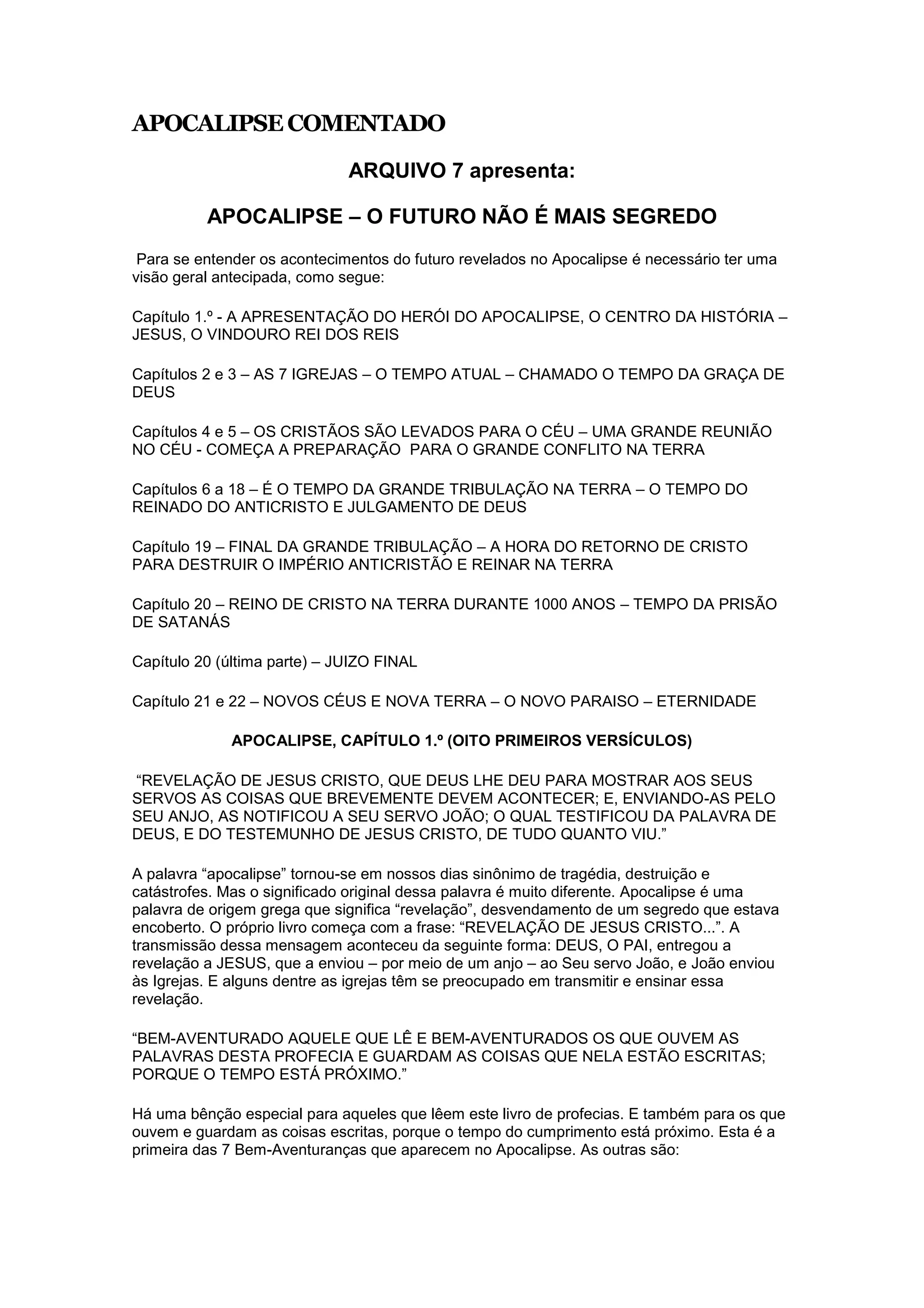 O documento apresenta um resumo do livro bíblico do Apocalipse, capítulo por capítulo. Explica que o livro contém revelações de Jesus sobre eventos futuros, divididos em sete partes e focados em números sete. O capítulo um introduz Jesus como o centro da história e descreve a visão de João do Senhor entre sete castiçais, representando as sete igrejas.