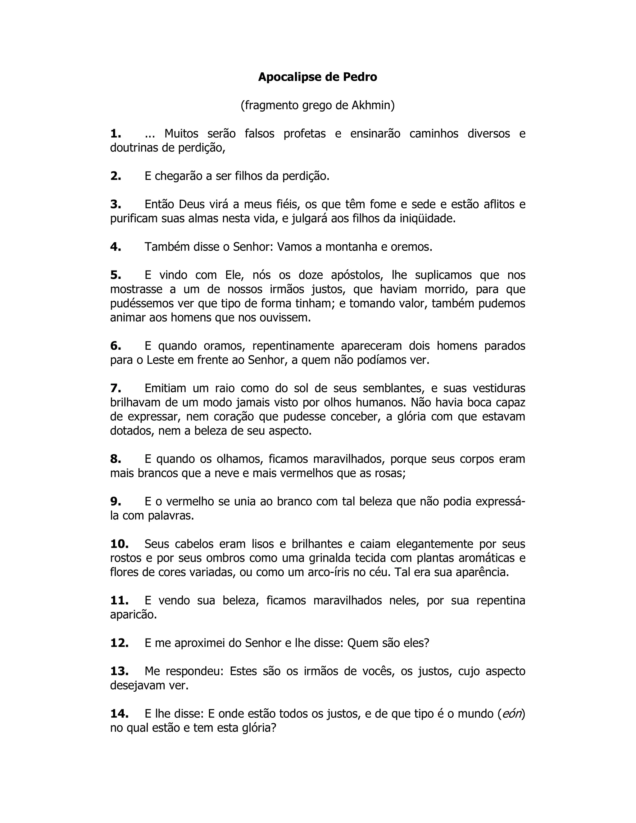O documento descreve visões do Apocalipse de Pedro sobre o destino das almas após a morte. Ele relata cenas do céu, onde os justos desfrutam de glória eterna, e do inferno, onde os pecadores sofrem tormentos terríveis adequados aos seus pecados, como queimar, ser devorado por vermes ou ser atormentado por demônios.