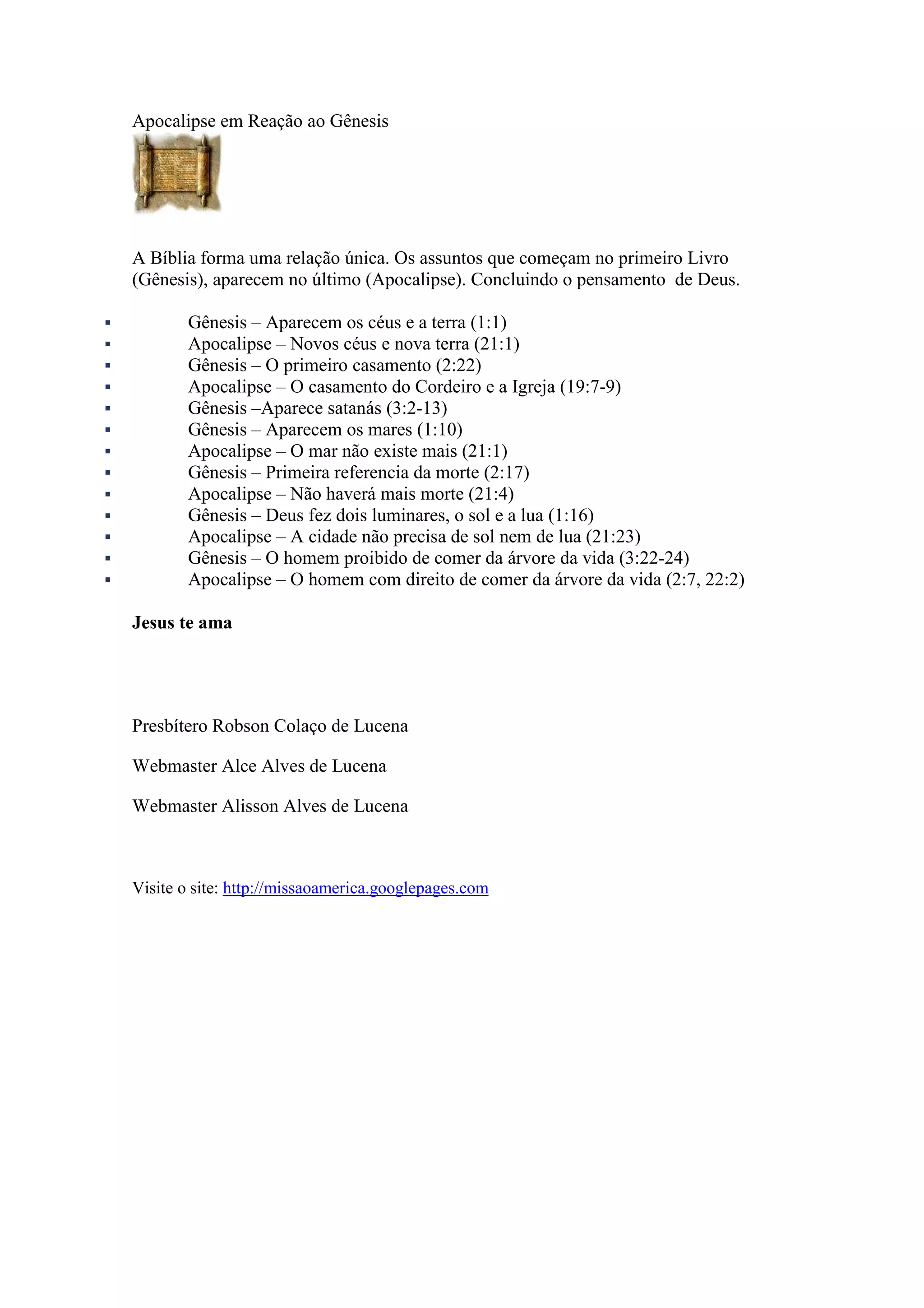 O documento explora como temas introduzidos no primeiro livro da Bíblia (Gênesis) aparecem no último livro (Apocalipse), mostrando como a Bíblia forma uma relação única ao concluir os pensamentos de Deus, com exemplos como a criação dos céus e da terra em Gênesis aparecendo no relato da nova terra e novos céus em Apocalipse, e o casamento em Gênesis ligado ao casamento do Cordeiro com a Igreja em Apocalipse.