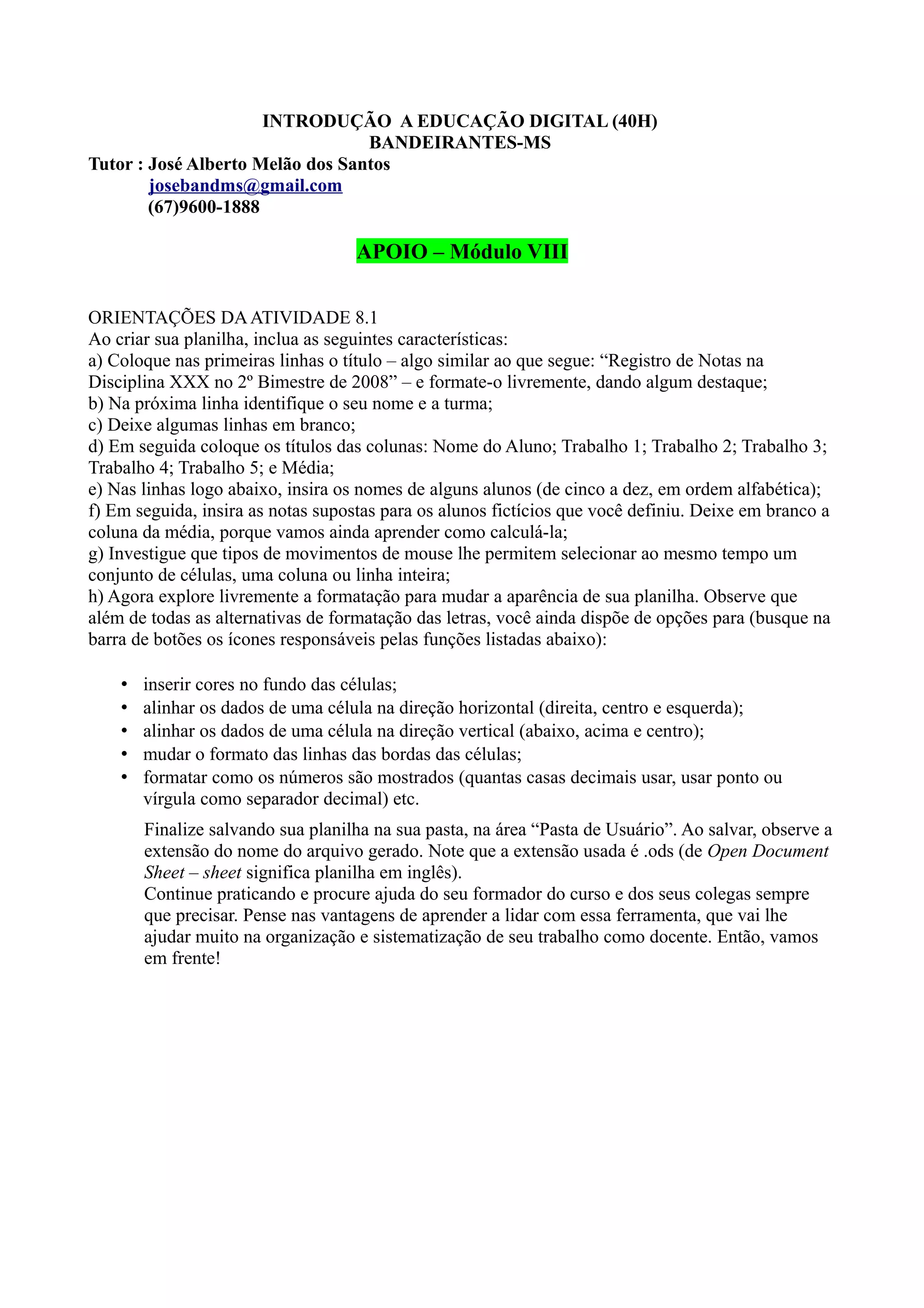 Este documento fornece instruções para atividades em planilhas eletrônicas, incluindo: (1) como criar uma planilha com títulos, nomes e notas de alunos fictícios; (2) como calcular médias usando fórmulas e arrastar o mouse; (3) como realizar multiplicações e somas; (4) como inserir gráficos; e (5) como usar operadores lógicos para resultados finais. O objetivo é praticar formatação e funções básicas em planilhas.
