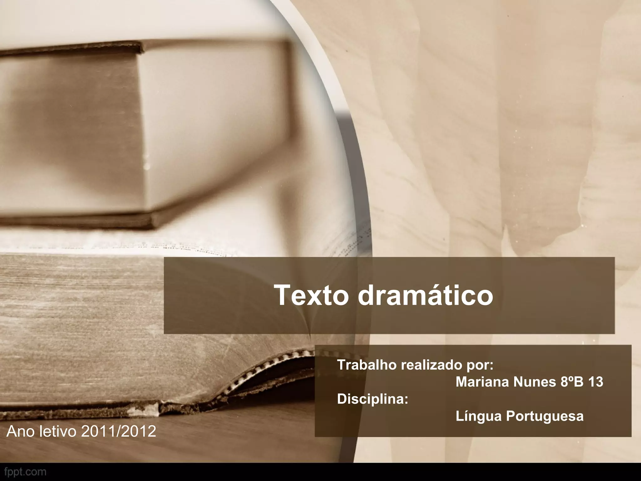 O documento descreve as principais características de um texto dramático, incluindo sua estrutura, personagens, espaço e tempo. Explica que um texto dramático é escrito para ser representado teatralmente e contém diálogos e indicações cênicas, além de abordar a classificação e caracterização de personagens e a estrutura interna e externa da peça.