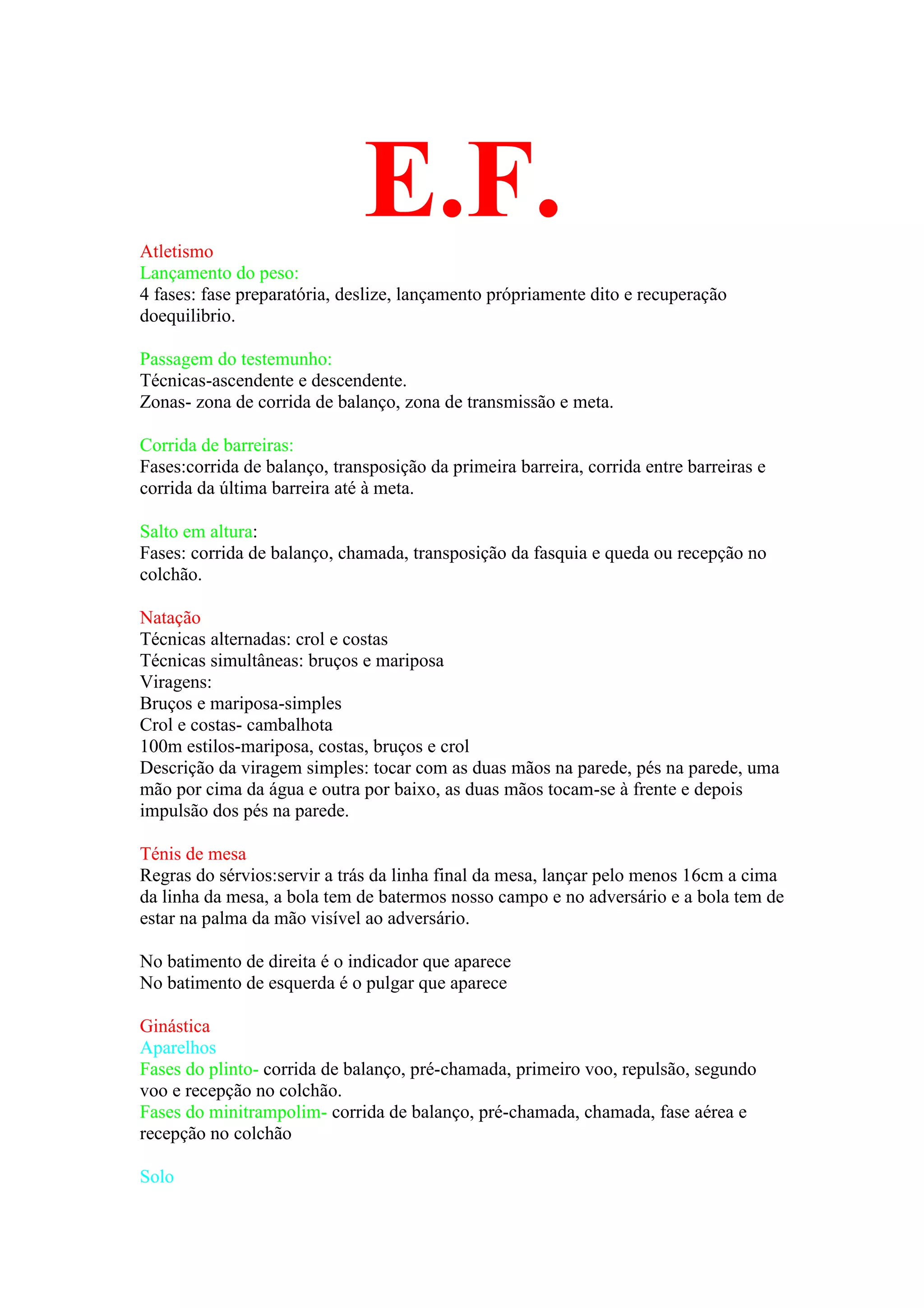 O documento resume vários esportes e suas técnicas fundamentais, incluindo atletismo, natação, tênis de mesa, ginástica, basquetebol, futsal, badminton e voleibol. Ele também descreve os componentes dos testes de aptidão física e uma rotina típica de aquecimento.