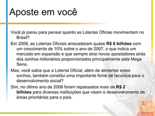 1) O documento descreve os benefícios de se associar a um clube que oferece apostas online em loterias oficiais, incluindo comodidade, praticidade e maiores chances de ganhar.
