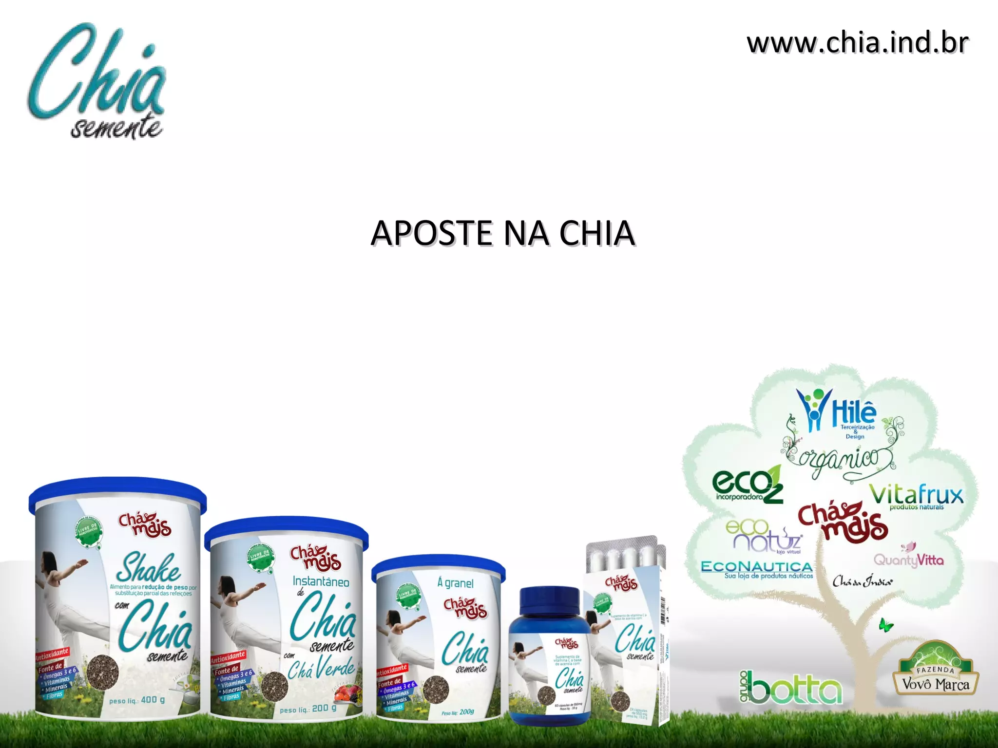 O documento promove os benefícios da semente de chia, que ajuda na saciedade ao formar um gel no estômago e pode auxiliar na manutenção do peso, indicando um site para venda de produtos de chia e receitas.