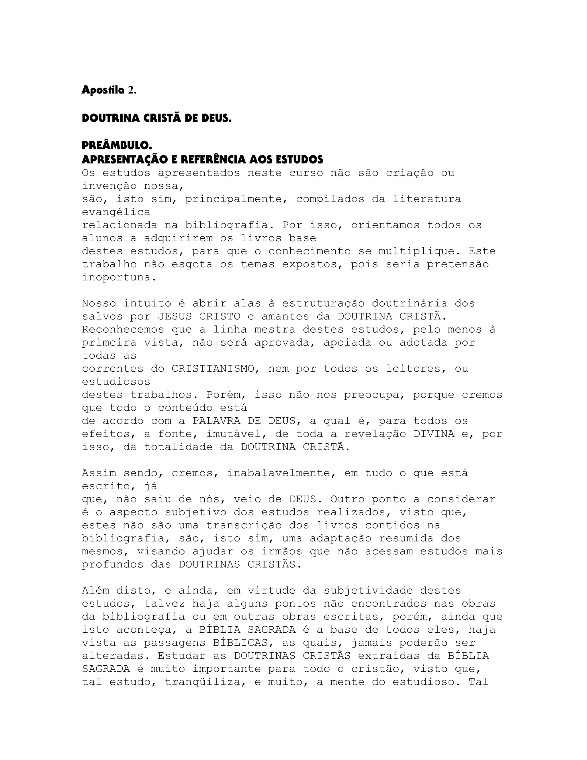 1) O documento apresenta os estudos da doutrina cristã de Deus, destacando que são compilados da literatura evangélica e não são criação própria. 2) Reconhece que a linha mestra dos estudos não será aprovada por todas as correntes do cristianismo, mas que o conteúdo está de acordo com a Palavra de Deus. 3) Define Deus como um ser espiritual, pessoal e perfeitamente bom que cria, sustenta e dirige todas as coisas com amor santo.