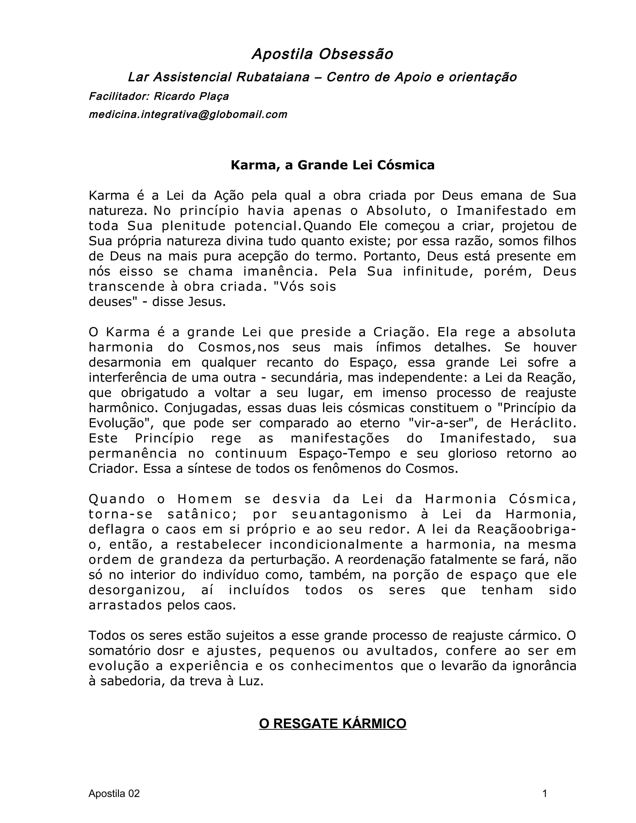 O documento discute o karma como a grande lei cósmica que rege a criação e a evolução. Explica que o karma é regido pelas leis da ação e reação e que o sofrimento é resultado das desarmonias causadas no passado, servindo para o aprendizado. Também descreve as 4 etapas do resgate kármico: conhecimento da desarmonia, aquiescência em resgatá-la, conhecimento do valor da desarmonia e o ressarcimento através do amor.
